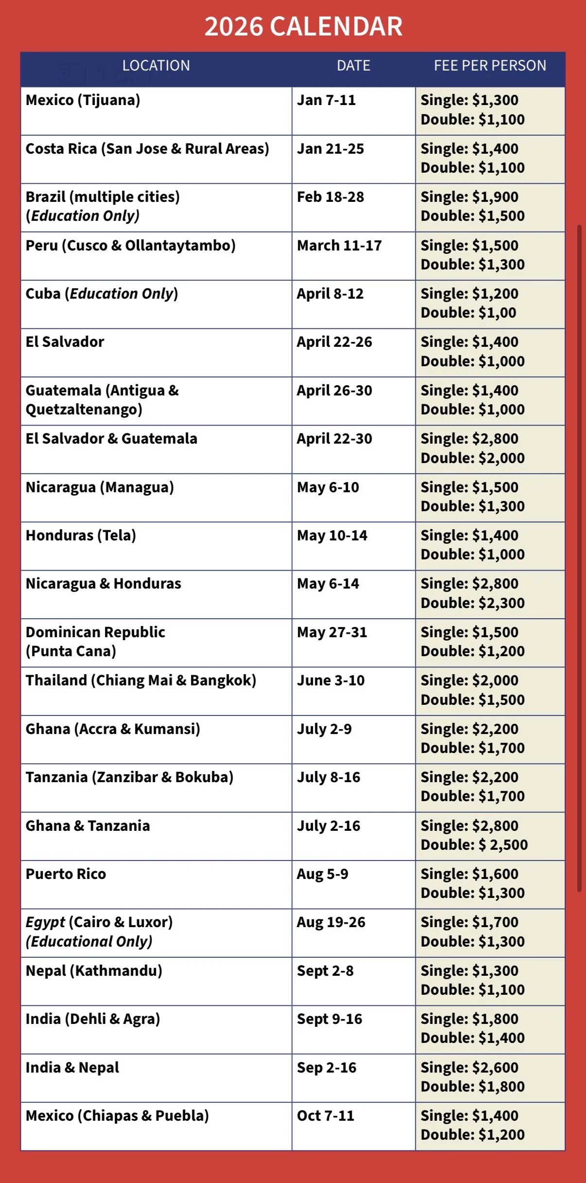 2026 Mission Calendar